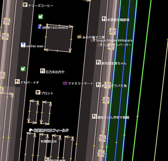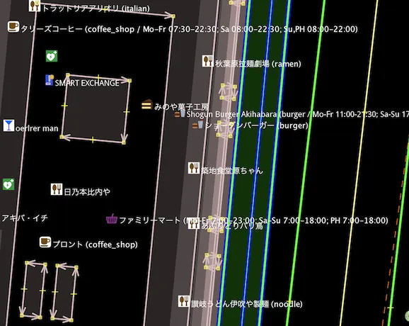こちらは秋葉原のとある場所。飲食店がたくさんあって、名前が表示されている。これらのお店にどれだけの情報がタグ付けされているか、QuickLabelを使ってチェックしていこう。