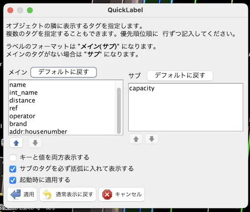 QuickLabelのダイアログには、「メイン」と「サブ」の2つの欄があるので、それぞれに表示したいkeyを書き込んでいく。すると、マップデータの中の各オブジェクトに対して、次のようなルールで設定が適用されていく。