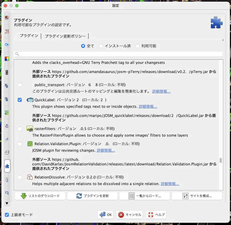 JOSMの設定画面を開き、プラグインタブを表示する。プラグイン一覧の中にある “QuickLabel” にチェックを入れればインストールできる。いったん再起動が必要となる。
