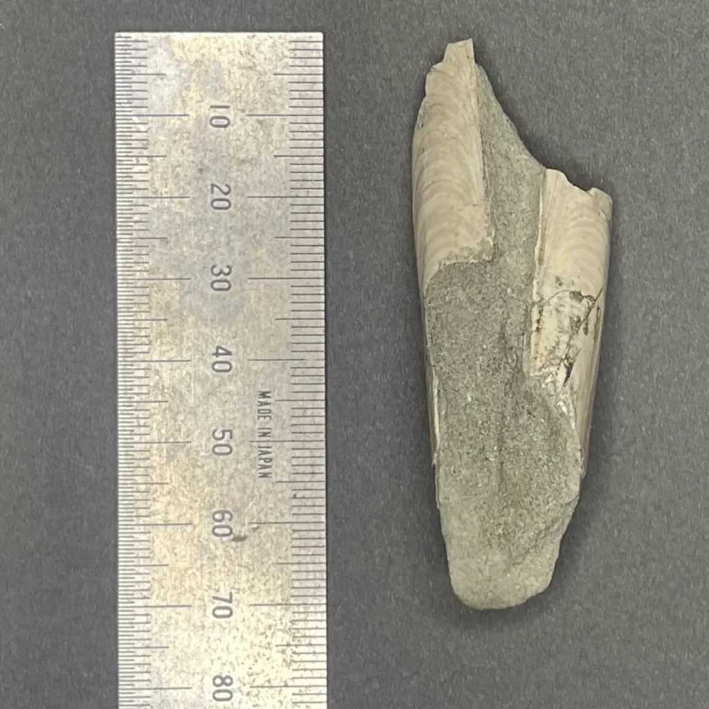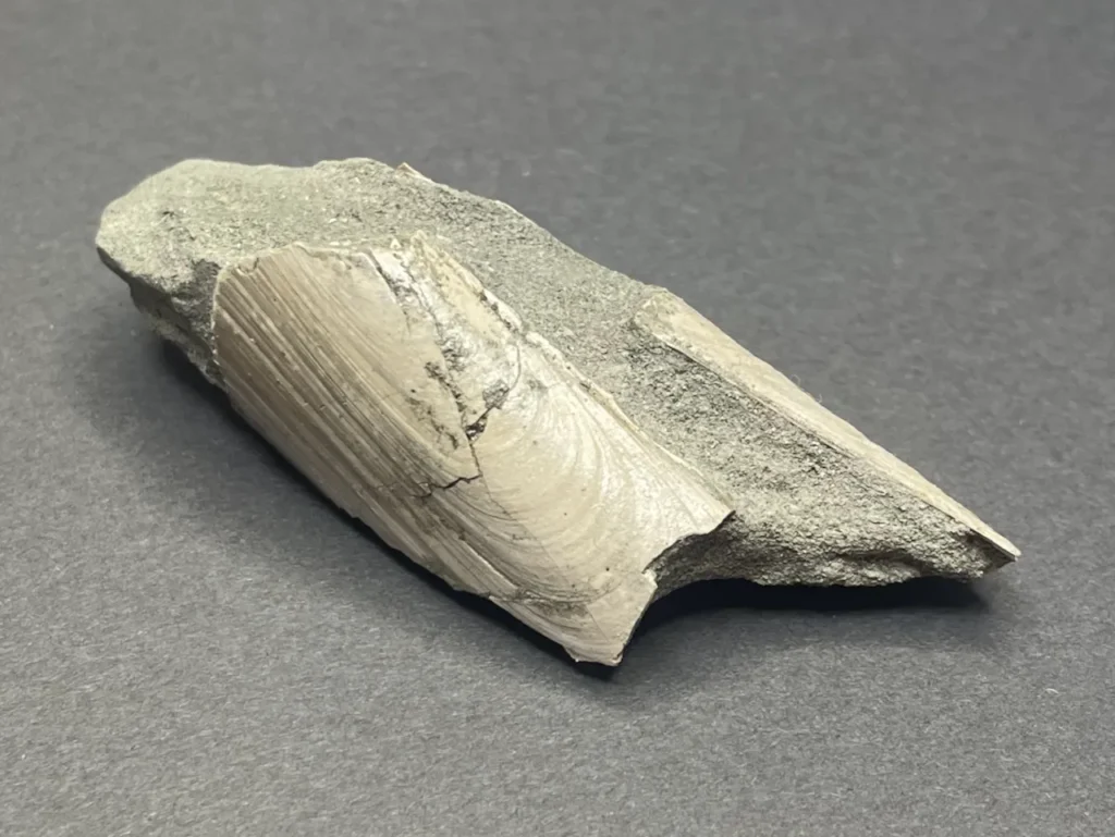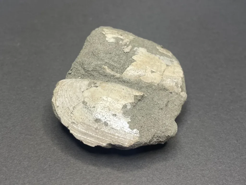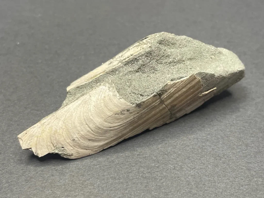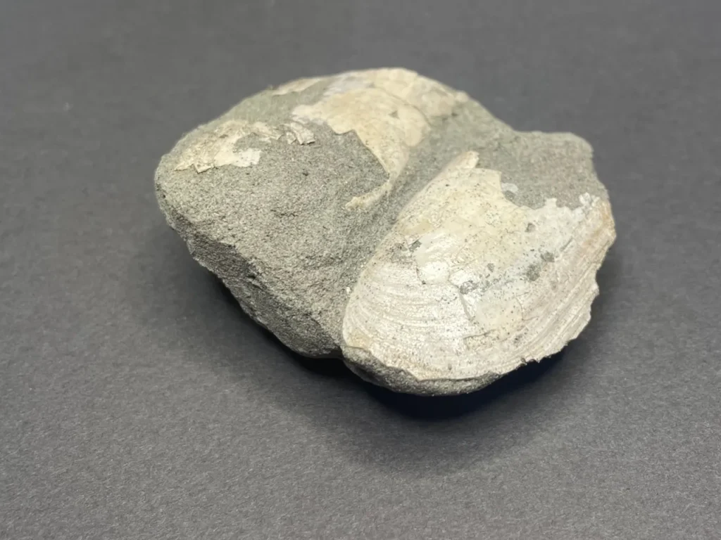 こちらは横長のフォルムの二枚貝。開いた状態で埋まっていた。だいぶ欠けているが、もとの形がなんとなくイメージできる。