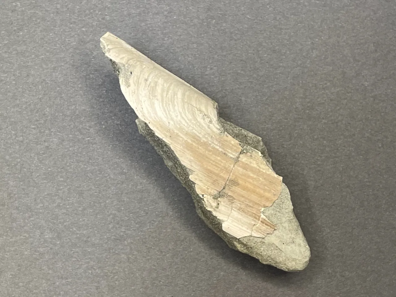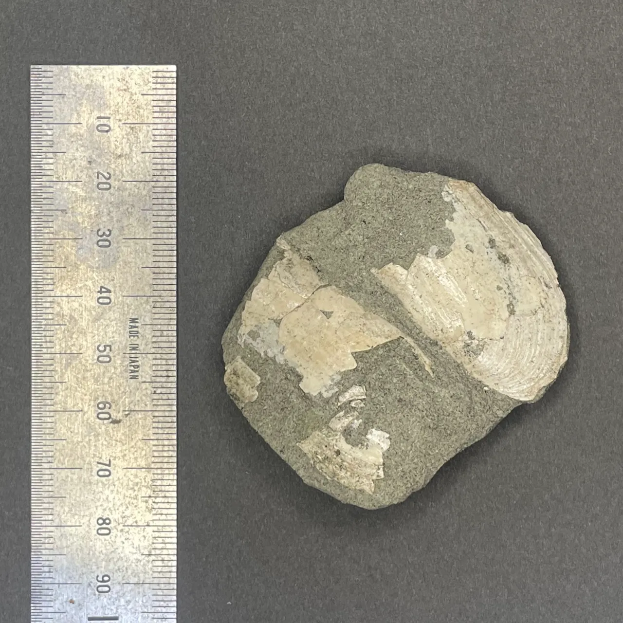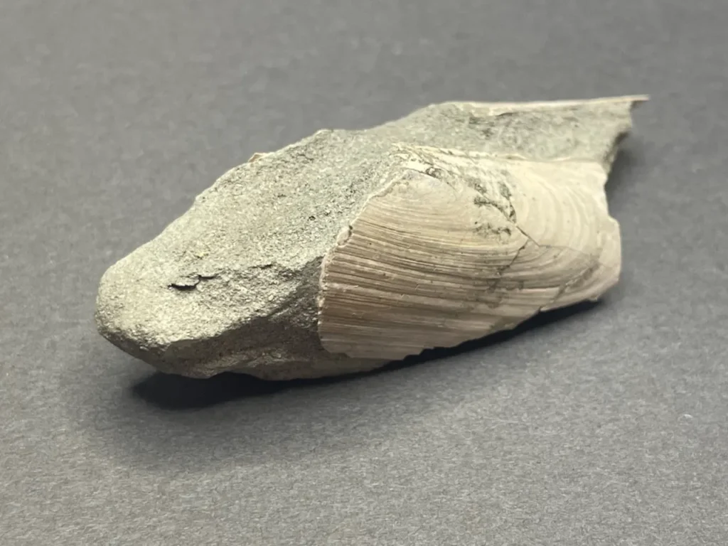 こちらは横長のフォルムの二枚貝。開いた状態で埋まっていた。だいぶ欠けているが、もとの形がなんとなくイメージできる。