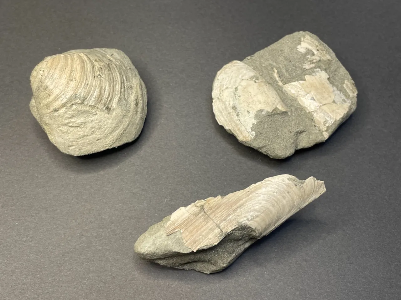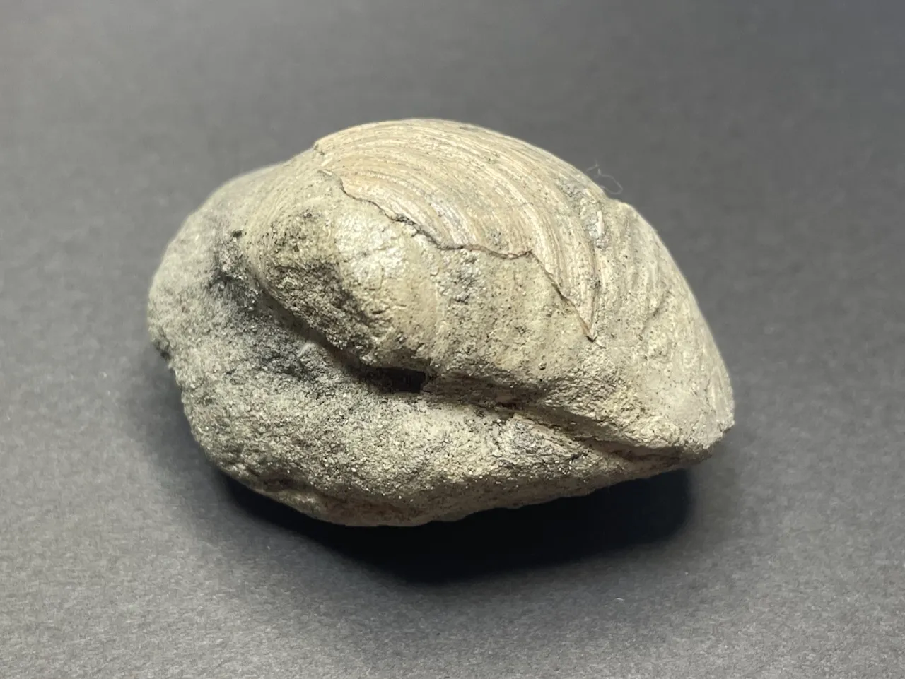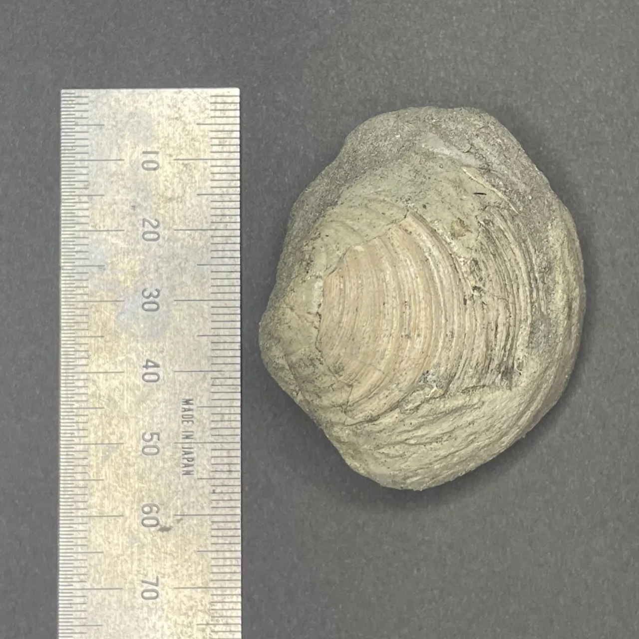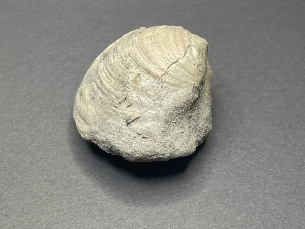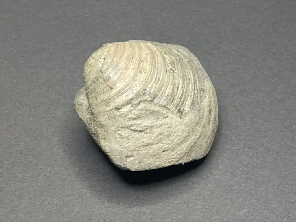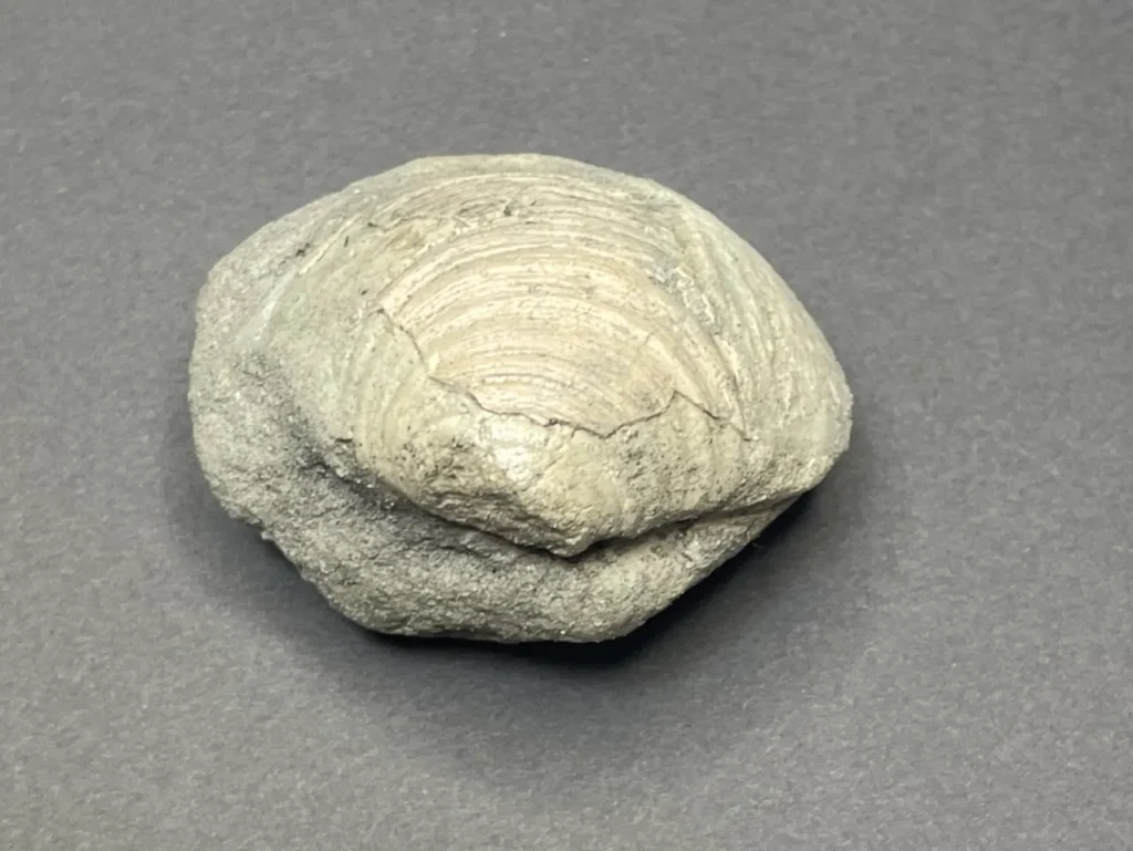 ボリュームのある二枚貝の化石。貝殻本体は一部しか残っていなかったが、全体の形が印象化石 (生き物の遺骸などに型取りされる形でできた化石) となっていた。