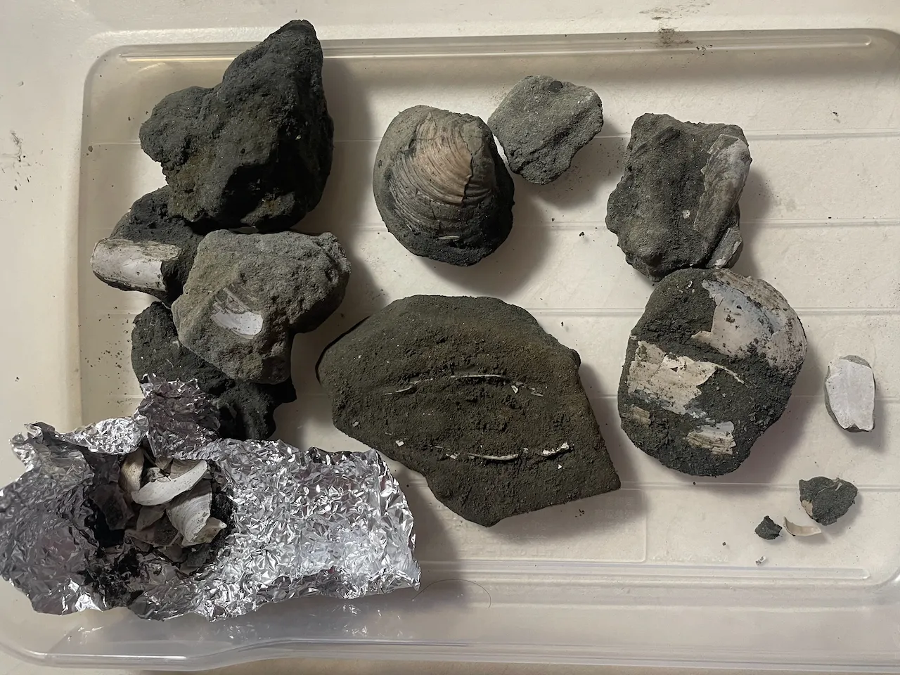 取り出した化石は周囲の母岩ごとアルミホイルや新聞で包み、壊れないように持って帰ろう。ワレモノ注意!