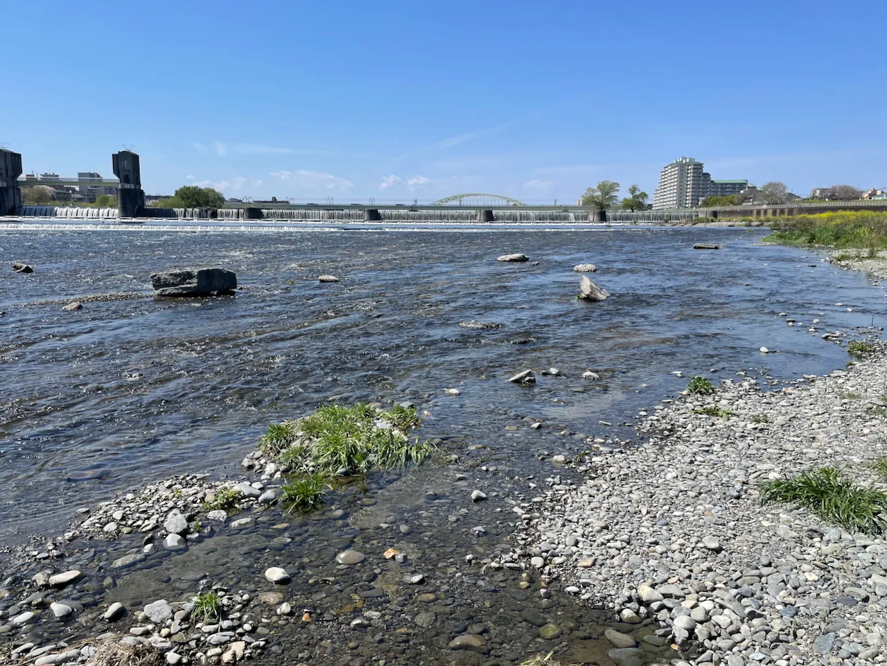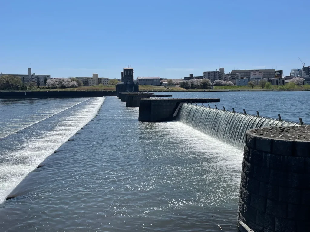 最寄り駅は小田急線の和泉多摩川駅。線路の東側、多摩川の堤防を下流に向かって進むと、二ヶ領宿河原堰がある。